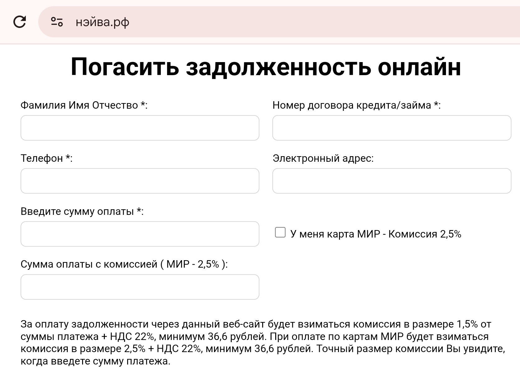 Личный кабинет на сайте «Нэйвы» не реализован. Уточнить детали задолженности можно через контакты. Вообще портал не блещет интерактивными «фишечками». Есть рабочие разделы с контактами, включая номер телефона горячей линии, с перечнем услуг для кредиторов, а также с формой для оплаты долга. Причем при переводе денег с карты «МИР» будет взята комиссия 2,5% [4]. Альтернативный способ погашения задолженности — оплата по реквизитам организации.