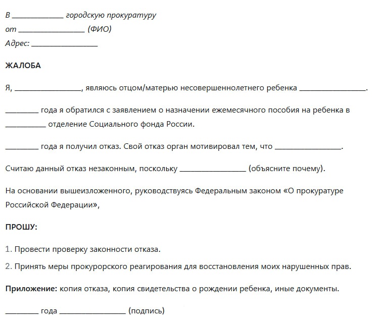 Прокуратура не назначает пособие вместо Социального фонда, но может выдать предписание об устранении нарушений. Подать жалобу можно через официальный сайт прокуратуры вашего региона, лично на приеме или отправив заказное письмо почтой.